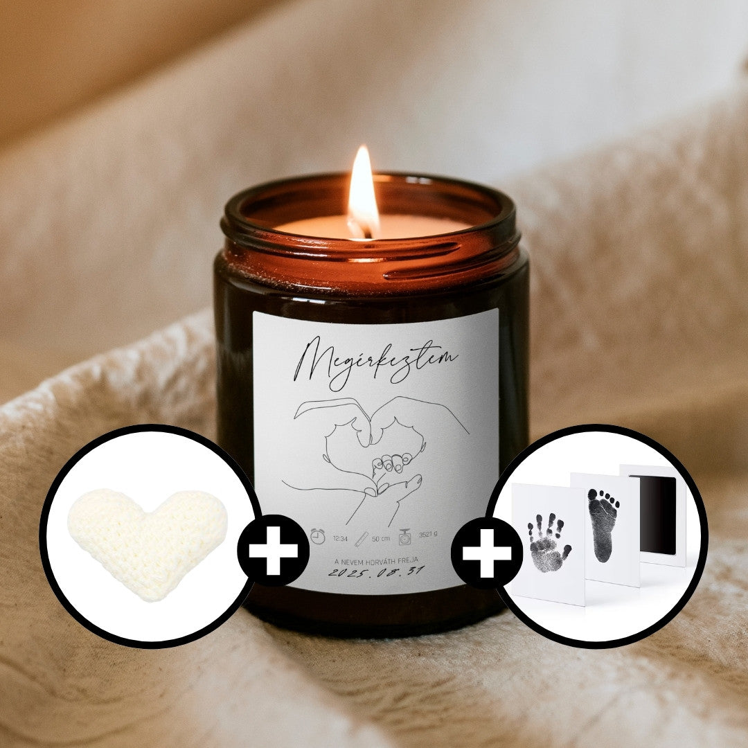A csomag része egy személyre szabható babaköszöntő gyertya, amin megadható a baba neve és születési adatai, egy kéz- és lábnyom készítő tintapárna, amivel tintával történő érintkezés nélkül örökíthetők meg az első lenyomatok, valamint egy kézzel készített bézs horgolt szív dísz, ami finom, kedves kiegészítője lehet ennek az emlékcsomagnak.