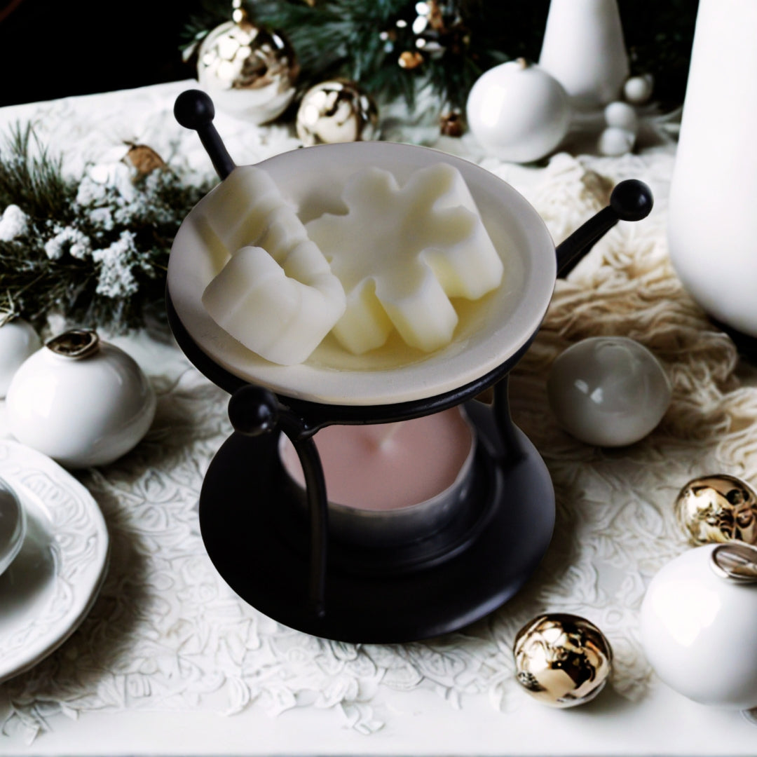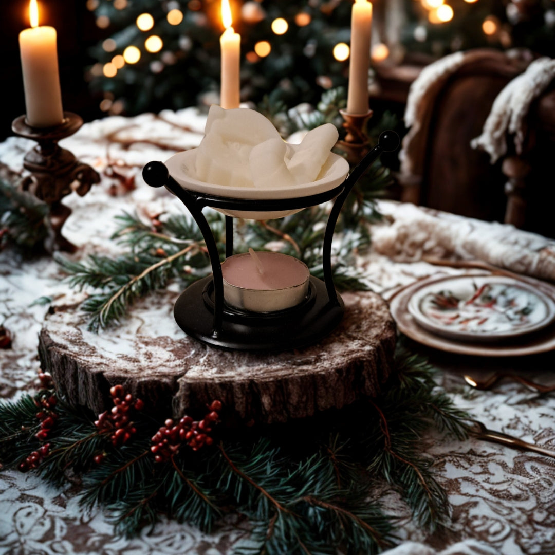 Varázsold otthonodba a karácsony melegét és illatait ezzel a különleges párologtató szettel! A fémvázas tartó és a kerámia tálka elegáns kiegészítője a téli estéknek, miközben az ünnepi formájú szójaviasz illatviaszok meghitt, karácsonyi hangulatot teremthetnek számodra.
